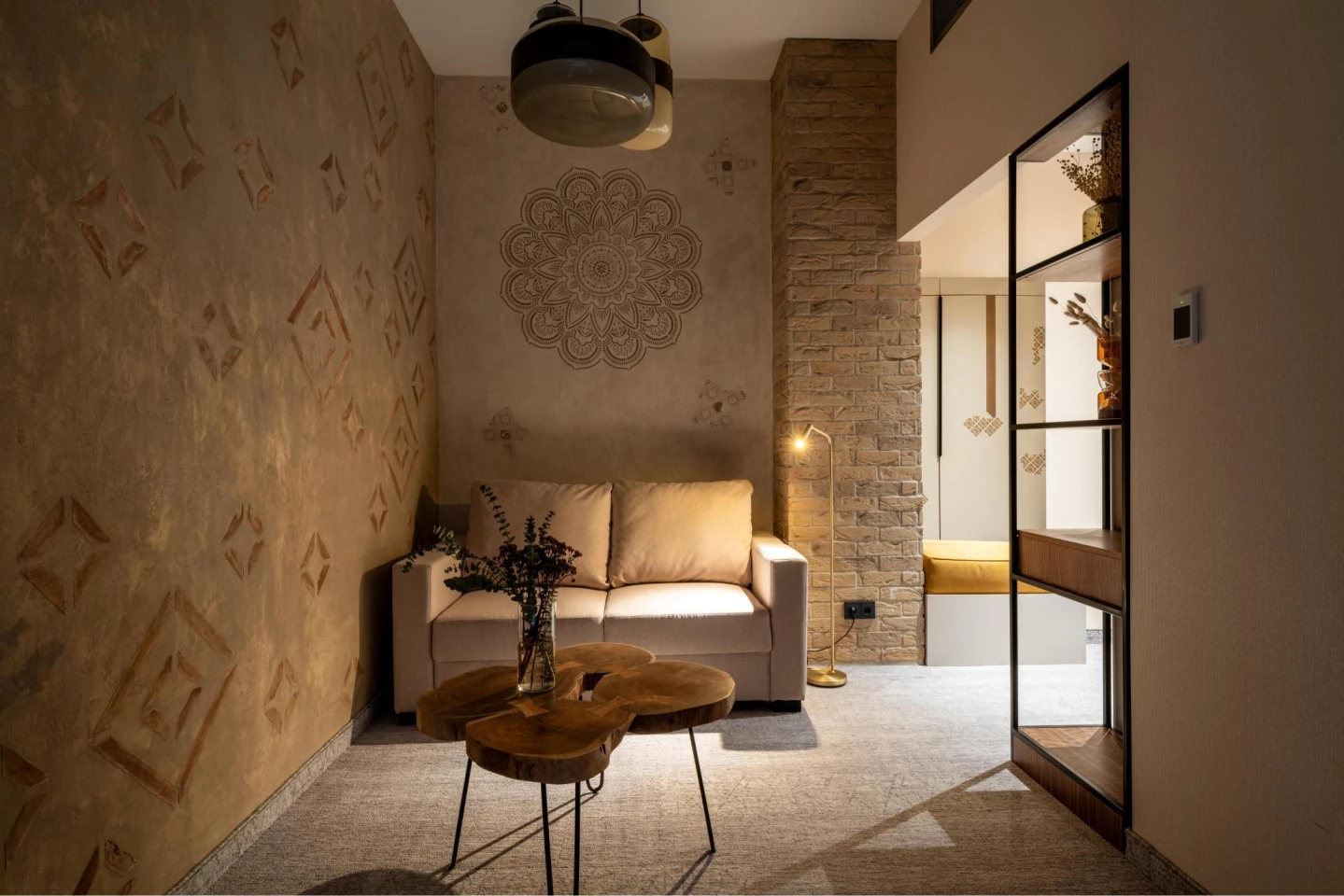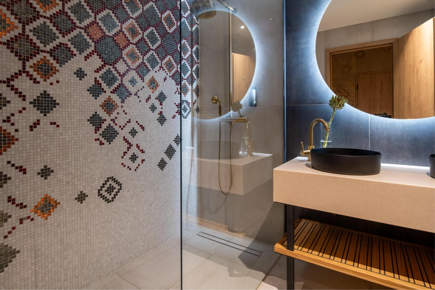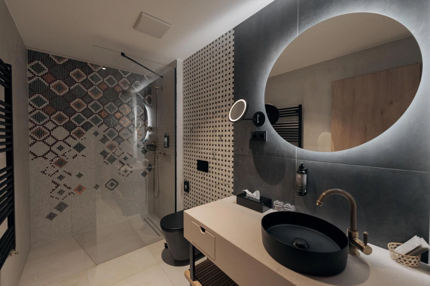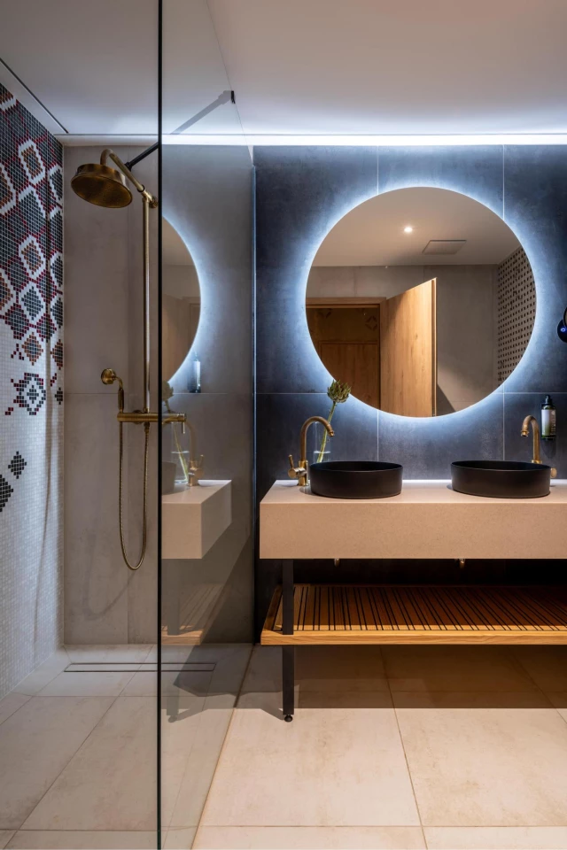 Szobai DEVON kád emeli a luxus fényét, míg a fürdőben egyedi saját szőnyegmintás olasz Sicis mozaikcsempe gondoskodik a kényelemről.